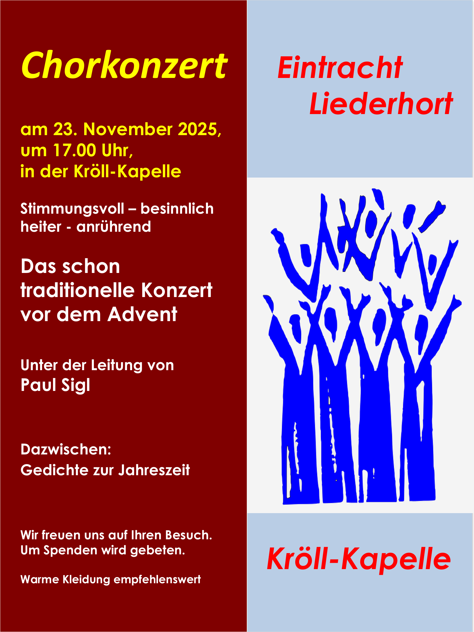 Die bekannte Chorgemeinschaft Eintracht Liederhort ist seit Jahren ein fester Bestandteil im Veranstaltungskalender des Fördervereins Lindauer Kulturerbe Alter Friedhof. Am Sonntag, 23. 11.2025 um 17:00 Uhr gibt der Chor in der historischen Kröll-Kapelle am Alten Friedhof ein stimmungsvolles Konzert mit bekannten und neuen Liedern. Paul Sigl hat die bewährte Leitung. In den kleinen Pausen werden herbstliche Gedichte vorgetragen. Der Eintritt ist frei, der Förderverein bittet aber um Spenden. Warme Kleidung ist in der unbeheizten Kapelle empfehlenswert.